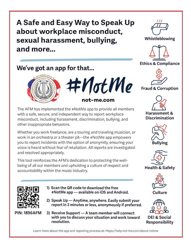 The AFM has partnered with NotMe Solutions to give members a secure, confidential, and user-friendly way to report workplace misconduct — including harassment, discrimination, contract violations, or unsafe conditions — while protecting your privacy and your rights.
